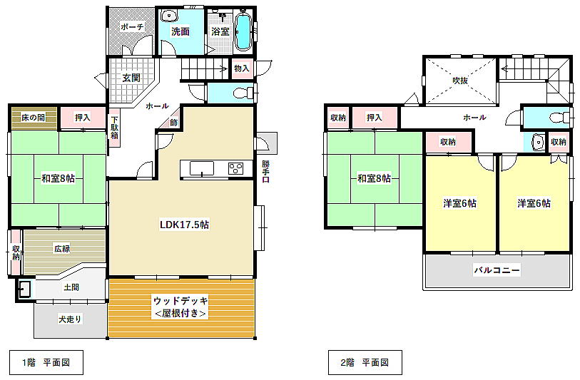 - ウッドデッキ付き(屋根あり)、1階の和室に続く広縁+土間には水回り付き、吹抜けのある玄関